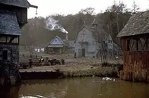 The original intention had been to shoot Sleepy Hollow predominantly on location with a $30 million budget.[25] Towns were scouted throughout Upstate New York along the Hudson Valley,[11] and the filmmakers decided on Tarrytown[17] for an October 1998 start date.[22] The Historic Hudson Valley organization assisted in scouting locations, which included the Philipsburg Manor House and forests in the Rockefeller State Park Preserve.[12] "They had a wonderful quality to them," production designer Rick Heinrichs reflected on the locations, "but it wasn't quite lending itself to the sort of expressionism that we were going for, which wanted to express the feeling of foreboding."[26] Disappointed, the filmmakers scouted locations in Sturbridge, Massachusetts, and considered using Dutch colonial villages and period town recreations in the Northeastern United States. When no suitable existing location could be found, coupled with a lack of readily available studio space in the New York area needed to house the production's large number of sets, producer Scott Rudin suggested the United Kingdom.[11]