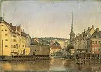 A row of Renaissance-style merchant houses, known as Nye Børs (New Børs) or the Six Sisters, were built at the end of the Børs building. The residential front houses faced Børsgade while a row of associated warehouses faced the Børs Dock. The buildings were demolished in 1900 to make way for a new headquarters for Privatbanken.[2] The Danish Africa company had established the Phønix sugar refinery at the mouth of the dock in 1657. It was taken over by De Danske Sukkerfabrikker in 1872 and remained in operations until 1888.[3] The Italian alchemist Giuseppe Borri had his laboratory in the street before it moved to the so-called Garrison Hospital in Sølvgade in 1669.[4]