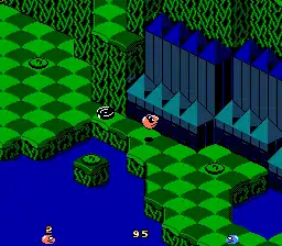 Each level contains various obstacles and enemies. Players lose a segment from their snake if they are hit by an enemy, and they lose a life if their snake runs out of segments.[2] Players can also lose a life if their snakes fall too far, the timer runs out, their snakes touch a sharp object, or if they are squashed by an object from above. Also, if they remain in some bodies of water for too long, a shark will attack. The game ends when players lose all their lives, but they have several continues in which they can restart the game from where they left off.[4] Players can defeat enemies by hitting them with their tongues or by jumping on them.[3] Players can collect various items to help them along during gameplay, such as items that extend the length of the snakes' tongues, provide extra lives and continues, add time bonuses, award invisibility diamonds, speed up the snakes, or reverse their directional controls.[5] Located throughout the game are "lids" (in the shape of manhole covers) which players can open to uncover Nibbly Pibbleys, items and extra lives, entrances to bonus levels, and sometimes enemies.[1][6] Also located in the game are hidden warps which allow players to skip several levels and restart at a later point in the game.[6]