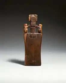 Most snuff trays are made of wood. Some are made of stone or bone, though there are very few examples of these materials being used.[1] Snuff trays are rectangular or trapezoidal in shape, depending on what style they are and have a shallow cavity running through them.[1] Their shape relates to the region as well as the culture that they originate from. Most snuff trays have been associated with the Tiwanaku (Tiahuanaco) or the Wari (Huari) culture. They may be decorated with intricate. hand-carved designs on one end as well as on the sides. Snuff trays with carvings represent iconographic motifs that are found in Tiwanaku and Wari art.[1]