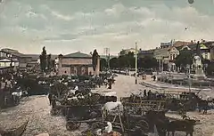 At the end of the 18th century, the Soldier settlement (Soldatskya sloboda) of Rostov-on-Don began to get massively populated. It resulted in the emergence of a local city square, where a market was organized. In February 1781, the construction of a wooden church of the Nativity of the Blessed Virgin Mary, near the site of the square was started. The church was consecrated in September of the same year, yet, however, it burnt down when a lightning stroke it ten years later. In 1860, instead of wooden church, a stone one in the name of Nativity of the Blessed Virgin was built, and it still stands. In 1887 there was built a bell tower, the upper part of which was dismantled during World War II so it could not be used as a mark for shelling.[1]