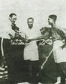 Before Independence in 1971, the 30s and 40s saw the football rivalry between Kolkata and Dhaka started under DSA (Dhaka Sporting Association), which was mainly created to develop players in the east.[3] The majority of the team was made out of students from Dhaka University, when they defeated Islington Corinthians 1–0, on 22 November 1937 .[4] During the liberation war in 1971, football was the way to create international awareness about the war of independence. The Swadhin Bangla Football Team was established which played 16 matches in India and was officially received by the BFF in 2009. Zakaria Pintoo, who was the captain of that team and the first person to wave Bangladesh's flag in a foreign land.[5][6]