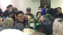 The next day, October 6, the press service of the Social Democrats informed about the unification with members of the SDPK, who "remained faithful to the values of social democracy." The party called the events that took place on the night of 6 October historical in a statement, "Once again, the Kyrgyz people, united by the desire for justice and freedom, overthrew the criminal government."[33] However, on 9 October, a large rally of the Coordinating Council on Ala-Too Square was dispersed by supporters Sadyr Japarov, and on 10 October, Atambayev was detained by special services and brought back to prison.[34] Later, he was released with the help of Spanish Prime-Minister Pedro Sanchez.