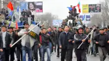 The Social Democrats took part in the October 2020 Kyrgyz parliamentary election, where according to preliminary results, the party failed to overcome the 7% electoral threshold required to enter the Supreme Council as the vast majority of parliamentary seats were won by pro-government parties.[30] On the evening of 4 October 2020, young party leaders of the Social Democrats Aizhan Myrsan, Temirlan Sultanbekov and Kadyrbek Atambaev refused to accept election results as they accused of them being allegedly rigged and instead called on their supporters to attend demonstration in the Ala-Too Square. The following day on 5 October, supporters of the Social Democrats were the first to protest in the square, with them eventually being joined by representatives of other opposition parties later that day who gathered their supporters at the Opera and Ballet Theatre.[31] The number of participants in the protest rally increased, by the evening protesters clashed with the police, which ended with the capture of the White House by the opposition, where the parliament and the presidential apparatus were located. The demonstrators released Atambayev from prison, who had been in custody since the Koi-Tash events of 2019. Eight opposition parties have created a Coordinating Council. The council included the Social Democrats, as well as the Respublika, Ata Meken, Butun Kyrgyzstan, Bir Bol, Zamandash, and Ordo parties. However, the Coordinating Council did not receive real political power.[32]