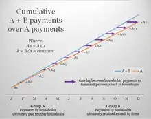Now the rate of flow of purchasing-power to individuals is represented by A, but since all payments go into prices, the rate of flow of prices cannot be less than A+B. The product of any factory may be considered as something which the public ought to be able to buy, although in many cases it is an intermediate product of no use to individuals but only to a subsequent manufacture; but since A will not purchase A+B; a proportion of the product at least equivalent to B must be distributed by a form of purchasing-power which is not comprised in the description grouped under A. It will be necessary at a later stage to show that this additional purchasing power is provided by loan credit (bank overdrafts) or export credit.[22]: 22–23