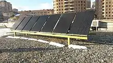 Solar thermal collectors are used throughout the territory of Armenia.[17] One building using solar thermal collectors is AUA, which uses solar cooling and ventilation systems. The biggest solar water-heater in Armenia is located at Diana hotel in Goris, which has 1900 vacuum tubes that provide hot water for a swimming pool with 180 cubic meter volume, and for 40 hotel rooms.[18]