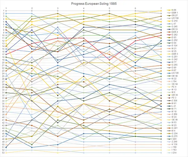 Remarkable is that the Norwegian team won this European Championship without a single race victory. The team of Jochen Schumann was in the lead until the final leg of the event. On the last moment team Terje Wang took the 8th place in the final race thus winning the event by just one point!