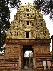 According to art historian George Michel, the general plan of the temple resembles that of the Someshvara temple in Bangalore, except, this temple is more rich in finish and detail.[3] The temple is noted for its tall superstructure (gopuram) over the main entrance (mahadwara). The superstructure is built of brick and stucco. Though both temples have a large open pillared mukhamantapa (hall) leading to the sanctum (garbhagriha), in Kolar the open mantapa has a central hall surrounded by a raised floor. Several ornate pillars on the raised floor support the ceiling of the mantapa. The main shrine has a dravida (south Indian) style tower (shikhara), a vestibule (sukanasi) that connects the sanctum to a navaranga (closed hall) which leads to the large pillared mukhamandapa. The temple is enclosed by a cloistered wall (prakara).[1] At the frontal extension of the hall are four full length pillars depicting riders on Yalis ("mythical beasts"). An ornate Kalyana mantapa ("marriage hall") built of granite, at the south-west corner of the complex, has pillars with decorative sculptures in relief.[3] Michell dates the temple to about the 17th century, but the Archaeological Survey of India dates the temple to the early Vijayanagara Empire rule of the 14th century. The base of the temple outer wall (adhishthana) consists of decorative moldings, with friezes of elephants, dwarfs and lions embellishing the upper moldings . The outer wall of the temple has miniature decorative pilasters (kumbha) with turrets (aedicule).[1]