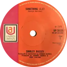 Among the song's many cover versions, Welsh singer Shirley Bassey recorded a successful version of "Something".[138] It was released in 1970 as the title track to her album of the same name.[139] Also issued as a single, it became Bassey's first top-ten hit in the UK since "I (Who Have Nothing)" in 1963, peaking at number 4 and spending 22 weeks on the chart.[140] The single also reached the top twenty in other European countries[141] and peaked at number 6 on Billboard's Easy Listening (later Adult Contemporary) chart.[142]