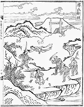Much of the academic research on the Song of Dorang-seonbi and Cheongjeong-gaksi has focused on its relationship to patriarchal social structures.[58] The long-ruling Joseon dynasty (1392—1910) of Korea sought to mold Korean family structures along Neo-Confucian patriarchal values, and a key part of this effort was the promotion of the social ideal of the "virtuous woman" (열녀/烈女, yeolnyeo): a wife totally devoted to her husband. Moralistic tracts published by the Joseon government include hundreds of stories of such "virtuous women," including dozens of young women who committed suicide when their husbands died and one tale of a young widow who cut off her hair, ears, and nose to protest her family's suggestions that she remarry.[59]