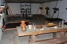 Soldiers of the Company of the National Presidio at San Francisco (Compania de Presidio Nacional de San Francisco) moved to the site of the recently secularized Mission San Francisco Solano in 1835. California Governor Jose Figueroa had ordered the Company north from the Presidio of San Francisco as part of his plan to comply with instructions from the national government to establish a strong garrison in the region north of the San Francisco Bay to protect the area from encroachments of foreigners.[5] An immediate concern was further eastward movement of the Russian America Company from their settlements on the California coast.[6] Construction of the barracks was episodic: digging the foundation began in 1837, construction of the adobe walls in 1839 and the building was more or less completed in 1840 to '41.[7] Until the building was habitable the troops were housed in the buildings of the old Mission.[8] While the barracks was built to house troops, most of the space was used as a headquarters and for supply, equipment and weapons storage.[7]