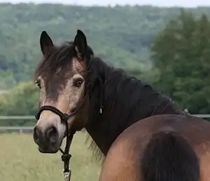 It was once thought that the sooty trait was responsible for turning chestnut into liver chestnut;[1] however, it is not known to uniformly darken the coat.[2] The sooty trait is responsible for many dark bays and has a particularly pronounced effect on buckskins and palominos.