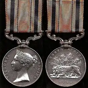 The South Africa Medal (1853) is a campaign medal instituted in 1854, for award to officers and men of the Royal Navy, British Army and locally recruited Cape Mounted Riflemen, who served in the Cape of Good Hope during the Xhosa Wars (called the 'Kaffir Wars' at the time) between 1834 and 1853.[1][2]