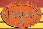 All the Class 8E locomotives were delivered in the SAR red oxide livery with signal red buffer beams and cowcatchers, yellow whiskers and with the number plates on the cab sides mounted on three-stripe yellow wings. In the 1990s some of them were repainted in the Spoornet maroon livery with a yellow and blue chevron pattern on the buffer beams and cowcatchers. In the late 1990s many were repainted in the Spoornet blue livery with either solid or outline numbers on the long hood sides.[5]