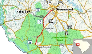 SC 10 is a 22.7 miles (36.5 km) two-lane, minor state highway in the southwest portion of the Upstate of South Carolina. The route runs generally south to north. Most of the route (particularly the southern portion) runs through or alongside the Sumter National Forest. The route begins just northwest of McCormick heading north to where is it begins a brief concurrency with US 221. The route continues on northward to Greenwood, where it enters the city's southwest side, ending at the US 25 Bus./US 178 Bus./SC 34 concurrency.[3]