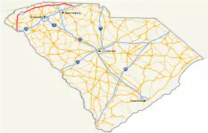 South Carolina Highway 11 (SC 11), also known as the Cherokee Foothills Scenic Highway, is a 119.850-mile (192.880 km) state highway through the far northern part of the U.S. state of South Carolina, following the southernmost peaks of the Blue Ridge Mountains. The route is surrounded by peach orchards, quaint villages, and parks. It is an alternative to Interstate 85 (I-85) and has been featured by such publications as National Geographic, Rand McNally, and Southern Living.[6]