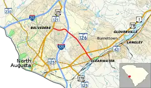 South Carolina Highway 126 (SC 126) is a 4.200-mile (6.759 km) primary state highway in the U.S. state of South Carolina. It directly links Belvedere with Clearwater, with a small portion in North Augusta.
