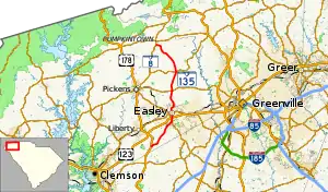 SC 135 begins at an intersection with U.S. Route 178 (US 178, Moorefield Memorial Highway) southeast of Liberty within Pickens County. It travels to the northeast and crosses Carmel Creek before entering Easley. The highway has a brief concurrency with SC 8 (Pelzer Highway). A very short distance after SC 8 splits off onto South 5th Street, the highway has an interchange with U.S. Route 123 (US 123; Calhoun Memorial Highway). It passes a U.S. Post Office and Gettys Middle School before intersecting SC 93 (Main Street). It immediately crosses over railroad tracks and turns right onto NE Main Street. One block later, it turns left onto North A Street. It crosses over Georges Creek and Mud Dog Branch before leaving the city limits of the city. SC 135 travels in a fairly northerly direction and crosses over Burdine Creek. It has an intersection with SC 183 (Farrs Bridge Road) and SC 186 (Earls Bridge Road). It begins traveling to the north-northwest and crosses over Shoal Creek. It curves to the northwest and crosses over Carpenter Creek. South of Pumpkintown, it crosses over Adams Creek and meets its northern terminus, another intersection with SC 8 (Pumpkintown Highway).[2]