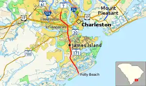 SC 171 begins at an intersection with Arctic Avenue in Folly Beach; the Folly Beach Fishing Pier and the Atlantic Ocean lie to the south. The route heads north-northwest through Folly Beach's business district as Center Street. From here, the highway crosses the Folly River onto Long Island; this crossing is the only road connecting Folly Island to the rest of South Carolina. The road passes several homes before crossing to James Island, where it turns to the north as Folly Road. After crossing James Island Creek, the highway meets the southern terminus of SC 30, also known as the James Island Connector. Past this junction, SC 171 intersects the eastern terminus of SC 700 before crossing Wappoo Creek to leave James Island. The highway heads through a mainly residential area to intersect U.S. Route 17; shortly thereafter, the route meets SC 61, and the two routes head west-northwest concurrently. After passing through a business district for 1.6 miles (2.6 km) the two highways separate, and SC 171 again heads northward. The highway passes Charles Towne Landing, a state historic site and the location of the first permanent English settlement in the state, before merging into SC 7 at its northern terminus.[2][3]