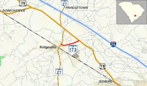 South Carolina Highway 173 (SC 173) is a 1.570-mile (2.527 km) primary state highway in the U.S. state of South Carolina. It serves to connect the town of Ridgeville with U.S. Route 78 (US 78). It is known as School Street for its entire length.