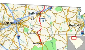 South Carolina Highway 18 (SC 18) is a 39.040-mile (62.829 km) primary state highway in the U.S. state of South Carolina. It serves to connect the cities of Union, Gaffney and Shelby, North Carolina.