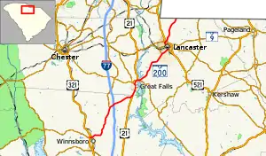 South Carolina Highway 200 (SC 200) is a 42.780-mile (68.848 km) primary state highway in the U.S. state of South Carolina. The highway travels more in a north–south direction, despite being signed as east–west. It connects the cities of Winnsboro, Great Falls, and Lancaster.
