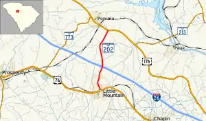 South Carolina Highway 202 (SC 202) is a 4.520-mile-long (7.274 km) state highway in the U.S. state of South Carolina. The highway connects Little Mountain and the Pomaria area. Though signed as an east-west highway, it runs in a south-to-north fashion.