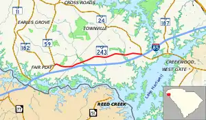 South Carolina Highway 243 (SC 243) is a 8.380-mile-long (13.486 km) state highway in the U.S. state of South Carolina. The highway travels on an east–west direction (though signed as north–south) from SC 59 and SC 182 in Fair Play to Interstate 85 (I-85) exit 11 and SC 24. The highway closely parallels I-85 to the north.