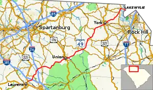 SC 49 is part of a three-state highway 49 (including North Carolina Highway 49 and Virginia State Route 49) that totals 325 miles (523 km) from Watts Mills, South Carolina to Crewe, Virginia.[6]