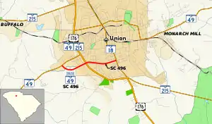 South Carolina Highway 496 (SC 496) is a 1.640-mile (2.639 km) primary state highway in the U.S. state of South Carolina. It serves as an unsigned state-maintained truck route through and around Union.