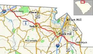 South Carolina Highway 5 (SC 5) is a 51.719-mile (83.234 km) primary state highway in the U.S. state of South Carolina. The highway, signed as north–south, travels in a northwest–southeast direction connecting the cities of Rock Hill, York and Blacksburg.
