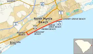 SC 65 begins at U.S. Route 17 (US 17) in North Myrtle Beach, near Atlantic Beach. It travels southeast along 27th Avenue South, heading one block towards the shoreline before turning northeast at South Ocean Boulevard, paralleling the ocean and shoreline businesses for the next 3+1⁄2 miles (5.6 km), including an intersection with Main Street. At the intersection with South Carolina Highway 9, SC 65 ends within the community of Cherry Grove Beach.[2]