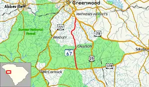 SC 67 begins at an intersection with U.S. Route 378 (US 378) in Sumter National Forest, east-northeast of McCormick, within Edgefield County. South of US 378, the roadway continues as Walker Road. It travels in a fairly northern direction through rural areas of the county. About one mile (1.6 km) later, it enters McCormick County. The highway only travels about three miles (4.8 km) through McCormick County before it enters Greenwood County. When SC 67 leaves the national forest, it passes through Callison. The highway keeps traveling through rural areas until it meets its northern terminus, an intersection with US 25/US 178, south-southeast of Greenwood.[4]