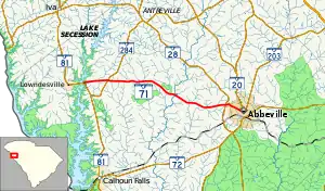 South Carolina Highway 71 (SC 71) is a 14.980-mile-long (24.108 km) state highway in the northwestern part of the U.S. state of South Carolina. The highway travels in a west-to-east orientation, however it is designated and signed as a north–south highway. Its southern terminus is at SC 20 in Abbeville, and its northern terminus is at SC 81 east of Lowndesville, completely within Abbeville County.
