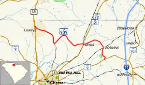 SC 909 is a two-lane rural highway that traverses from U.S. Route 321 (US 321) in Lowrys to SC 9 near Richburg. The route zig-zags in northern Chester County connecting small communities, and provides access to the Chester Catawba Regional Airport.[2][3]