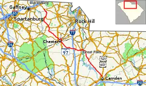 South Carolina Highway 97 (SC 97) is a 89.800-mile (144.519 km) state highway in the U.S. state of South Carolina. The highway connects Camden, Great Falls, Chester, and Hickory Grove.