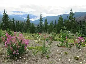 The Engelmann Spruce-subalpine fir zone (ESSF), located below the tundra, is a continuous forest composed of conifers with Engelmann spruce, alpine fir in drier sites, and white bark pine and lodgepole pine in wet sites.[7] The most common shrub found in this zone is the white-flowered rhododendron, followed by black huckleberry, grouseberry, and false azalea.[7] The meadows are dominated by heath, flowers and grasslands.[7] Snow can linger long enough in this zone to provide moisture for the Indian hellebore, arrow-leaved groundsel, paintbrush, sitka valerian, and many other herbs.[7]