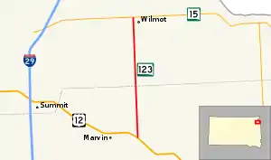 South Dakota Highway 123 (SD 123), 467th Avenue, is a 10.486-mile (16.876 km) north–south state highway in Grant and Roberts counties in South Dakota, United States, that connects U.S. Route 12 (US 12) with South Dakota Highway 15 (SD 15).[3]
