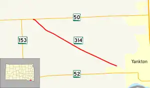 South Dakota Highway 314 (SD 314) is a 3.751-mile-long (6.037 km) state highway in southwestern Yankton County, South Dakota, United States, that runs from SD 50 to the western city limits of Yankton.