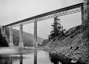 The ceremonial cutting of the first sod for the SD&LUR was at Kirkby Stephen on 25 August 1857, and that for the EVR was at Appleby on 28 July 1858. Land for two tracks purchased, but a single track line was laid.[8] Bouch had laid out an economical route that followed the contours and avoided tunnels, but there were formidable gradients up to the 1,370 feet (420 m) high Stainmore Summit. Valleys were crossed by viaducts, including three made from wrought-iron that crossed the Tees, Deepdale and Belah rivers and cost a total of £77,400.[9] The viaducts at Tees Valley, Deepdale, Belah and Smardale Gill were built wide enough for two tracks.[8]