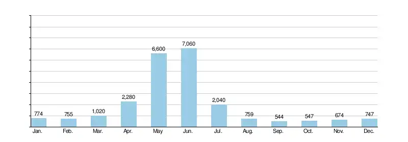 The United States Geological Survey (USGS) operated a stream gage at the mouth of the South Fork between 1993 and 2003, recording an annual mean of 1,983 cu ft/s (56.2 m3/s). The highest annual mean was 3,125 cu ft/s (88.5 m3/s) in 1997, and the lowest was 869.9 cu ft/s (24.63 m3/s) in 2001. Mean monthly discharge rates for the South Fork are displayed in the below graph.