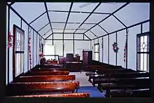 The South Sea Islander Church is a single-storey, timber building, set on concrete stumps, with a gabled roof clad with corrugated iron. The church is clad externally with chamferboards. Louvred timber ventilators are located high in the west & east elevations (gable ends). Two sets of casement windows are located in the north & south elevations (long ends). Each window has a simple, diamond decorative motif in the central panel. There is an entry door and set of timber stairs at each end of the church in the southern elevation. Ramp access has been recently added to the church.[1]