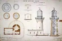 The lighthouse was designed by Colonial Architect James Barnet,[3] and it is one of three concrete lighthouses built during that period, the others being Smoky Cape Lighthouse and Green Cape Lighthouse.[2] Barnet had visited the island in October 1877, to determine the best locations for the buildings and the sources for materials.[2] Cement and sand for the construction were transported to the island at harsh conditions, while broken stone was quarried on the island itself.[3] Timber came in small vessels from Bellingen.[2] Though construction was expected to finish by 1879, as the carving "18VR79" on the keystone over the entry doorway suggests,[4] it was first exhibited on 18 March 1880.[5]