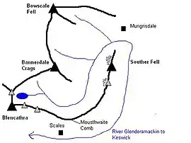 The western side of the fell stands above the enclosed valley of the upper Glenderamackin, looking across to Bannerdale Crags. Souther Fell has two principal tops and each stands above a patch of scree and rock on this face. A footbridge crosses the river just north of Mousthwaite Comb, the only reliable crossing between here and Mungrisdale village.