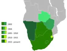 Following the Second Boer War, and the establishment of British control over the Boer republics, the Southern African Customs Union was formed in 1903 with the signing of a new Convention and replaced the previous arrangements. It consisted of Cape Colony (to which British Bechuanaland had been annexed in 1895), Basutoland, Bechuanaland Protectorate, Natal, Orange River Colony (the former Orange Free State), Transvaal Colony (the former South African Republic), and Southern Rhodesia. Swaziland joined in 1904 and North-western Rhodesia joined in 1905. In 1906 another convention was signed which superseded the 1903 agreement and retained all of the previous members.[7][8] In its current configuration it was established in 1910[9] pursuant to a Customs Union Agreement between the Union of South Africa and the High Commission Territories of Bechuanaland, Basutoland and Swaziland. Southern Rhodesia and North-western Rhodesia (later to become Northern Rhodesia after 1911) had declined to join the 1910 Agreement[10] but did maintain a common tariff and free trade arrangements with South Africa and the High Commission Territories (with some variations and exceptions) from 1910 until 1935. An attempt was made in 1949 to re-establish a customs union between South Africa and Southern Rhodesia, but it ultimately failed to do so.[7]