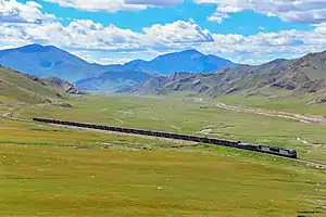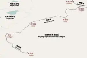 The Southern Xinjiang railway or Nanjiang railway (simplified Chinese: 南疆铁路; traditional Chinese: 南疆鐵路; pinyin: Nánjiāng tiělù), is a railway between Turpan and Kashgar in Xinjiang, China. The railway is 1,446 km (899 mi) in length and runs along the southern slope of the Tian Shan mountain range, connecting all major cities and towns of the Northern Tarim Basin, including Turpan, Hejing, Yanqi, Korla, Luntai (Bügür), Kuqa, Toksu (Xinhe), Aksu, Maralbexi (Bachu), Artux, and Kashgar.[1][2]