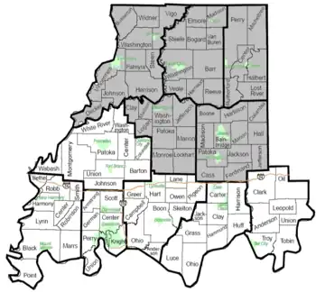 IN: Gibson, Posey Vanderburgh, Warrick KY: Henderson, Webster |