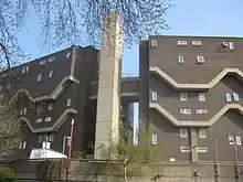 It was designed in 1968-70 by a team of architects including Magda Borowiecka, and built between 1972-1981.[5] The building was designed to account for the South Cross Route motorway passing adjacent to the building, and although the motorway plan was scrapped in 1973, the design was kept, including small windows on the wall that would have faced this flyover.[1] Borowiecka said "The motorway would have been 60ft up in the air, so I needed to create a blank wall going up higher than that. It was rather miserable and I had to think of some way to make an interesting building."[1]
