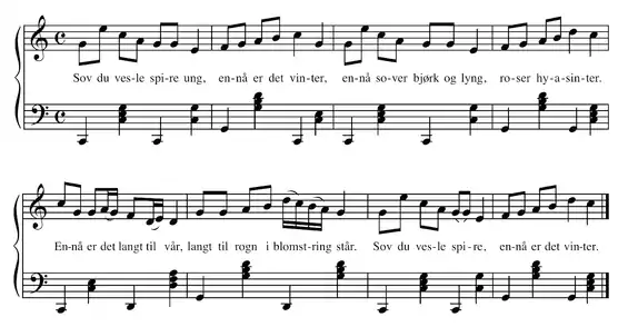 - In 1900 the Danish-Swedish composer Preben Nodermann (1867–1930) published a melody (with minor modifications of Topelius's text) titled Solskenets visa ("Sunshine's song") in Sex visor för barn ("Six songs for children").[7] Danish and Norwegian versions of the song, entitled Solskinnsvise, have become well known and have been published in Norway both as sheet music and as recordings.[8]