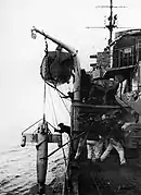 By the end of the war, Boyky's anti-aircraft armament consisted of two 34-K mounts, five 37-millimeter (1.5 in) 70-K AA guns in single mounts, two twin-gun mounts for Lend-Lease, water-cooled 12.7 mm Colt-Browning machine guns and two single mounts for DShK machine guns. She had received a British ASDIC system and a Type 286 search radar. After the war, all of her AA guns were replaced by eight water-cooled V-11M versions of the 70-K gun in twin mounts and her electronics were replaced by Soviet systems.[8]